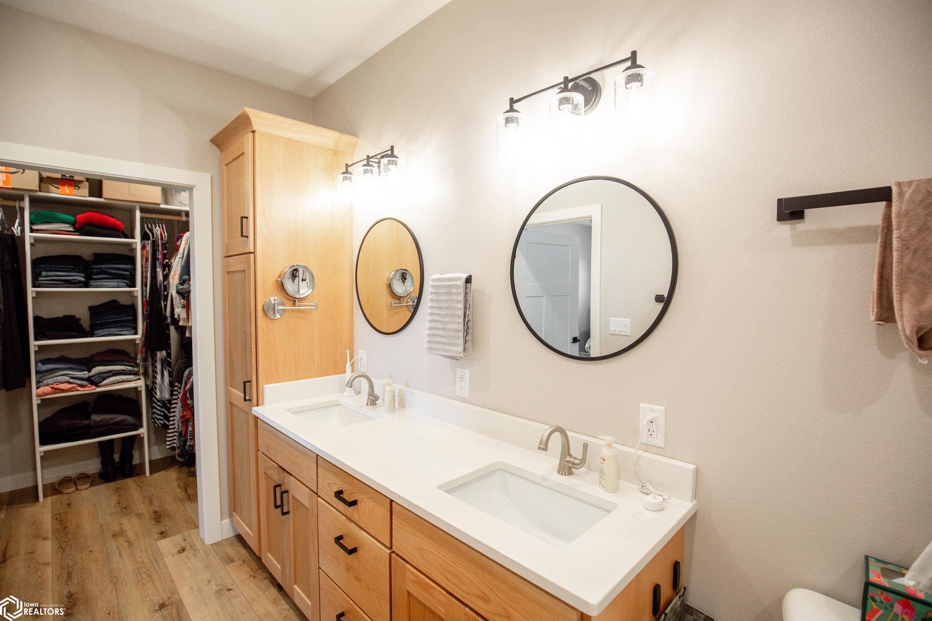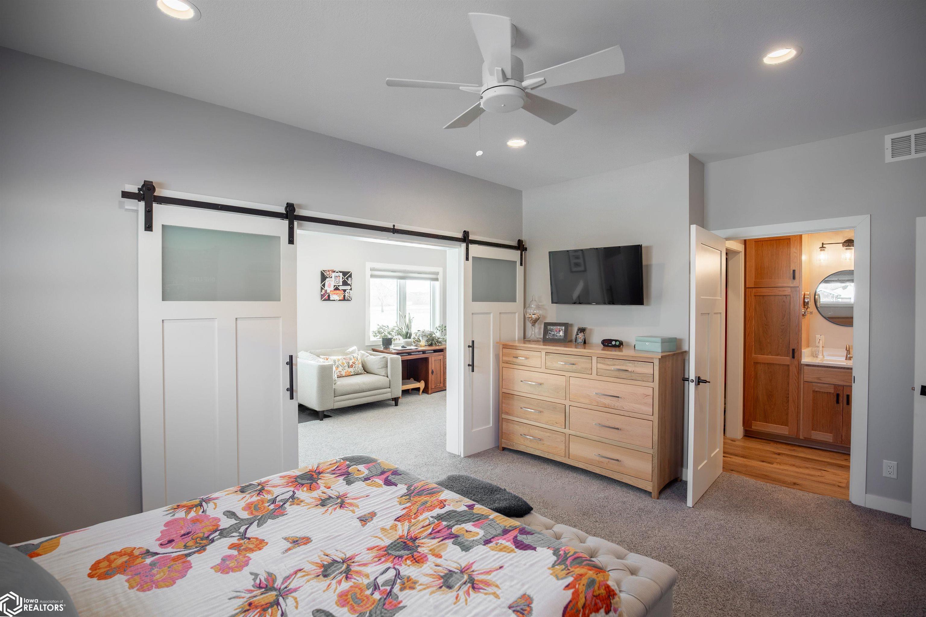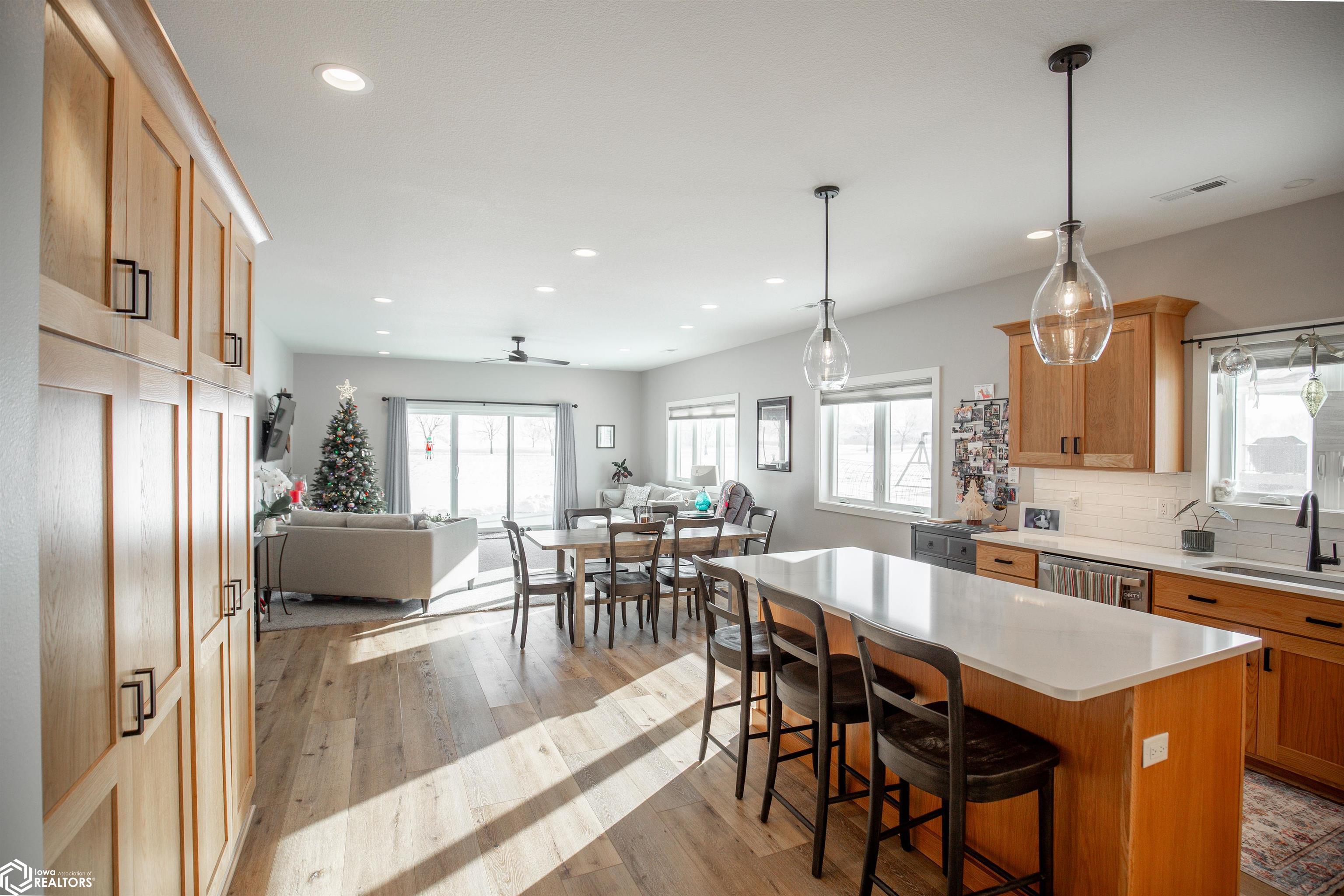 Beautiful ranch-style home on a spacious lot on Algona’s east side, this newer build (completed in 2021) offers 1,872 square feet of quality, single-level living. The kitchen is bright and inviting, featuring quartz countertops, a white subway tile backsplash, custom natural-oak shaker cabinetry, and stainless steel appliances. Luxury vinyl plank flooring connects the kitchen and dining area, transitioning naturally into the cozy, carpeted living room. A sliding glass door off the living room opens to a covered back porch overlooking the yard — a perfect spot for grilling, relaxing, or outdoor dining. Included in backyard is a 10'X12' storage shed with concrete floor and loft. The master suite includes a large double vanity that matches the kitchen cabinetry, a floor-to-ceiling linen cabinet, a spacious step-in shower, and a walk-in closet. A bonus room, separated by sliding barn doors, offers a second walk-in closet and flexible space for a home office, exercise area, or hobby room. One additional bedroom is located at the front of the home, offering privacy for guests, while the second bedroom sits near the master suite along with the full bathroom. The laundry area is conveniently located in the mudroom that connects to the attached double garage. The garage includes a floor drain, space for a workbench, storage shelving, and a built-in storm shelter that also serves as extra storage. Enjoy easy living on Algona’s east side— Call to set up your private showing.
